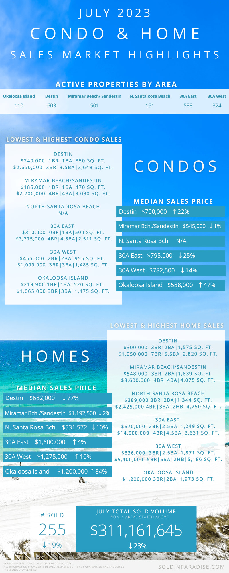 Discover the captivating real estate landscapes of Destin, 30A, Miramar Beach, Santa Rosa Beach and the surrounding areas through a lens of illuminating statistics. These idyllic coastal destinations offer not only stunning vistas of sugar-white sands and azure waters but also a dynamic housing market that continues to pique the interest of both buyers and sellers. In this exploration, we delve into key statistical highlights that shed light on property trends, market fluctuations, and investment opportunities across these sought-after locales of the Florida Panhandle. Whether you're an aspiring homeowner, a curious investor, or simply captivated by the allure of coastal living, these real estate statistics provide invaluable insights into the ever-evolving housing dynamics of this enchanting region.